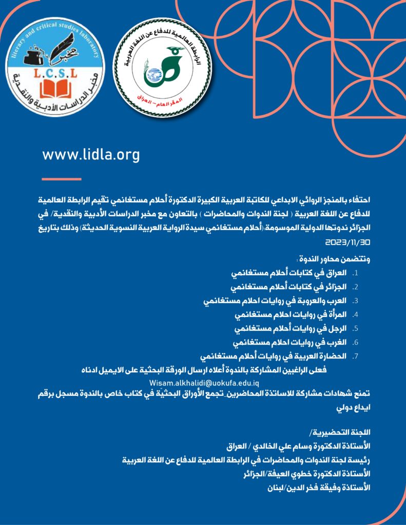 احتفاء بالمنجز الروائي الابداعي للكاتبة العربية الكبيرة الدكتورة أحلام مستغانمي تقيم الرابطة العالمية للدفاع عن اللغة العربية ( لجنة الندوات والمحاضرات ) بالتعاون مع مخبر الدراسات الأدبية والنقدية/ في الجزائر ندوتها الدولية الموسومة:(أحلام مستغانمي سيدة الرواية العربية النسوية الحديثة) وذلك بتاريخ 30/11/2023